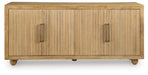 This accent cabinet offers abundant storage with casually cool style and versatility. Its four doors, accented with fluting and goldtone metal pulls, conceal two fixed shelves perfect for dinnerware, cookbooks or anything you want to tuck away. The natural and cream antiqued finish over solid mango wood complements a wide range of decor, making it an easy addition to your living or dining area.