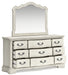 | Details | B980B5: Includes headboard, footboard and rails, Made with hardwood solids, spruce veneer, MDF substrates and cast resin components , Antiqued white painted finish, Polyester upholstery, Button tufting, Foundation/box spring required, sold separately, Mattress available, sold separately, Assembly required, B980B1: Includes dresser and mirror, Made with hardwood solids, spruce veneer, MDF substrates and cast resin components, Antiqued white painted finish, 9 drawers with fully finished interiors, French and English dovetail construction and ball-bearing side glides, Metal bar pulls with aged pewter-tone finish, Mirror attaches to back of dresser, | |