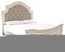 Elevating the art of traditional cottage styling, this bedroom set is your dream retreat realized. A sumptuous beauty, the upholstered bed wows with a distressed chipped white finish for heirloom appeal. Deep tufting on the cushioned upholstered headboard adds such a cozy element sure to put you at ease. Framed drawer fronts, decorative corbels, bail pulls and contrasting wood finished surfaces only add to the charm.