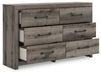 Combining a casual aesthetic with functional flair, this dresser suits styles from rustic to industrial. Its smooth-gliding drawers store everyday essentials with ease, from clothes to bed linens. Elongated drawer pulls in a dark hue polish off the look, harmonizing beautifully with the weathered gray wood grain.