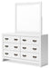 | Details | B427B9: Includes California king panel headboard, footboard, rails and slats, Made with hardwood solids, okoume veneer and MDF substrates, White finish, Foundation/box spring required, sold separately, Mattress available, sold separately, Assembly required, B427B1: Includes dresser and mirror, Made with hardwood solids, okoume veneer and MDF substrates, White finish, 6 drawers with dovetail construction and metal center guides, Hardware with dark finish, Drawer interiors are lined with a wood grain laminate for a clean, finished look, Mirror attaches to back of dresser, | |