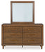 | Details | Includes dresser and mirror, Made with hardwood solids, mango wood veneer and MDF substrates, Medium brown wood-tone finish, 6 drawers with fully finished interior, dovetail construction and heavy duty ball-bearing side glides, Round tapered legs, Mirror attaches to back of dresser | |