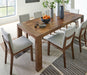 Experience worry-free living with this dining package. Designed to effortlessly blend casual and refined aesthetics, the rich brown butcher block veneer exudes a modern, relaxed vibe you'll love. And the washable Next-Gen Nuvella™ performance fabric handles life's little messes with ease. Styled to comfortably seat eight, this set makes room for one and all.