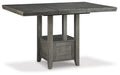 Cool and on-trend. This counter-height dining package sports an antiqued gray finish and gray textural fabric for a contemporary-yet-casual feel. The table features a storage base and removable leaf for extra seating room, making it a breeze to clear off clutter and expand your table space. Comfortably cushioned, the barstool features a padded seat, while its contoured comb-back design adds a dash of geometric flair. With this set, it's easy to dine in style.