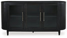 | Details | Made with hardwood solids and oak veneer, Black finish on textured wood grain surface, 3 glass cabinet doors, Interior shelving, Burnished nickel-tone pulls, Tapered legs, Assembly required | |