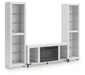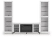 Details Includes TV stand with electric fireplace and 2 piers, Made with engineered wood (MDF/particleboard/plywood) and decorative laminate for the right balance of affordability and durability, Matte white finish with subtle replicated wood grain, Decorative laminate replicates natural or man-made material surfaces with consistent color, pattern and texture, Legs with black finish, TV stand with 4 backlit glass shelves, Pier with 4 backlit glass and single engineered wood shelves , Fireplace insert and backlit shelves feature color and brightness controlled LED lighting, 3 color settings for synchronized LED lights: blue, red and white, Remote control with LED display, Power cord included; UL Listed, Minor assembly required
