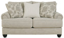 This loveseat has an alluring look that's guaranteed to turn heads. Richly textured fabric in a light, easygoing hue is enhanced by even lighter flax peeking through. Distinctive roll arms add a dab of debonair, while indulgently plush cushions cradle you softly. Sit back and relax in comfort and style, with plenty of room to stretch out and unwind at the end of a long day.
