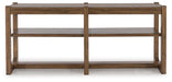 This sofa table sits comfortably at the intersection of modern lodge and farmhouse aesthetics. Your warm and welcoming disposition is reflected in the charming architectural elements and light brown glazed finish. Even with its poise, this table remains practical. With its multifunctional design, it doubles as a stunning TV stand or as a bookcase in the office.