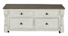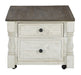 Details Made of pine wood, pine veneer and engineered wood, Two-tone finish; distressed weathered gray top with distressed vintage white base, Antiqued iron-tone hardware, Casters for easy mobility, 4 storage drawers (2 large front drawers and two smaller side drawers), Lift-top design