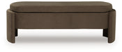 There’s more to this upholstered storage bench than what meets the eye. Its soft heathered brown upholstery provides a comfy sitting area. Lift the hinged seat to reveal lots of storage for pillows, blankets or other essentials. Coupled with its unique capsule shape, this bench is full of form and function.