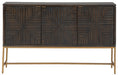 This accent cabinet is a versatile stunner with 3 geometric patterned door fronts in warm dark brown accented with goldtone finish metal hardware. Standing on a goldtone metal open frame base, the three-door console is aesthetically contemporary and sophisticated, ready to serve as buffet, console or media cabinet.
