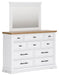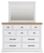 | Details | B844B4: Includes panel headboard, storage footboard, rails and roll slats, Footboard made with hardwood solids, MDF substrates and butcher block oak veneer, Headboard and rails made with hardwood solids and MDF substrates, White finish, Headboard with inset black metal barn sash, 2 drawers in footboard with fully finished interior, dovetail construction and ball-bearing side glides, Pulls with matte black finish, Bed does not require a foundation/box spring, Mattress available, sold separately, Assembly required, B844B1: Includes dresser and mirror, Made with hardwood solids, MDF substrates and butcher block oak veneer, Dresser with 2-tone finish (white finish; butcher block oak veneer with natural finish), Pulls with matte black finish, 10 spacious drawers with fully finished interiors (top drawers felt lined), dovetail construction and ball-bearing side glides , Drawers with inset picture fronts, Mirror attaches to back of dresser, | |